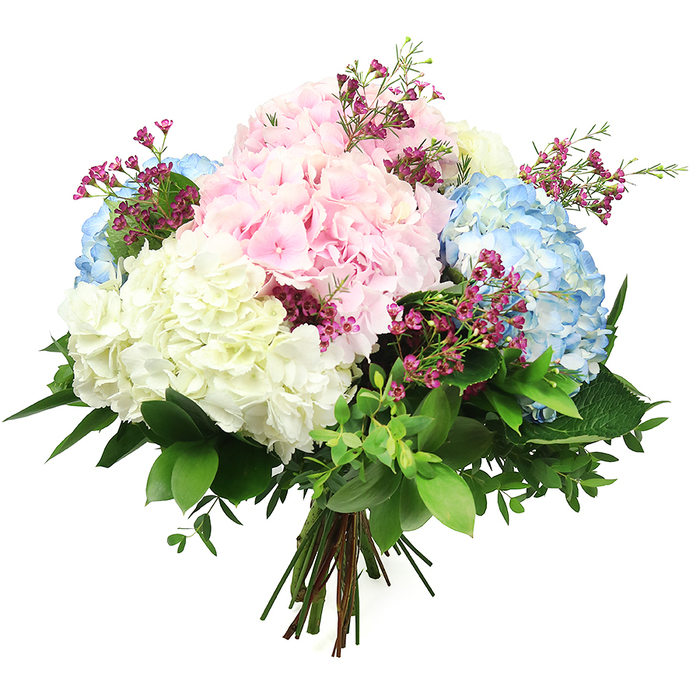 Strike a sophisticated note with this elegant bouquet, which pairs delicate pink, white and blue hydrangea. Finished with vibrant pink wax and Ruscus, it’s just the perfect way to show someone special how much you care.