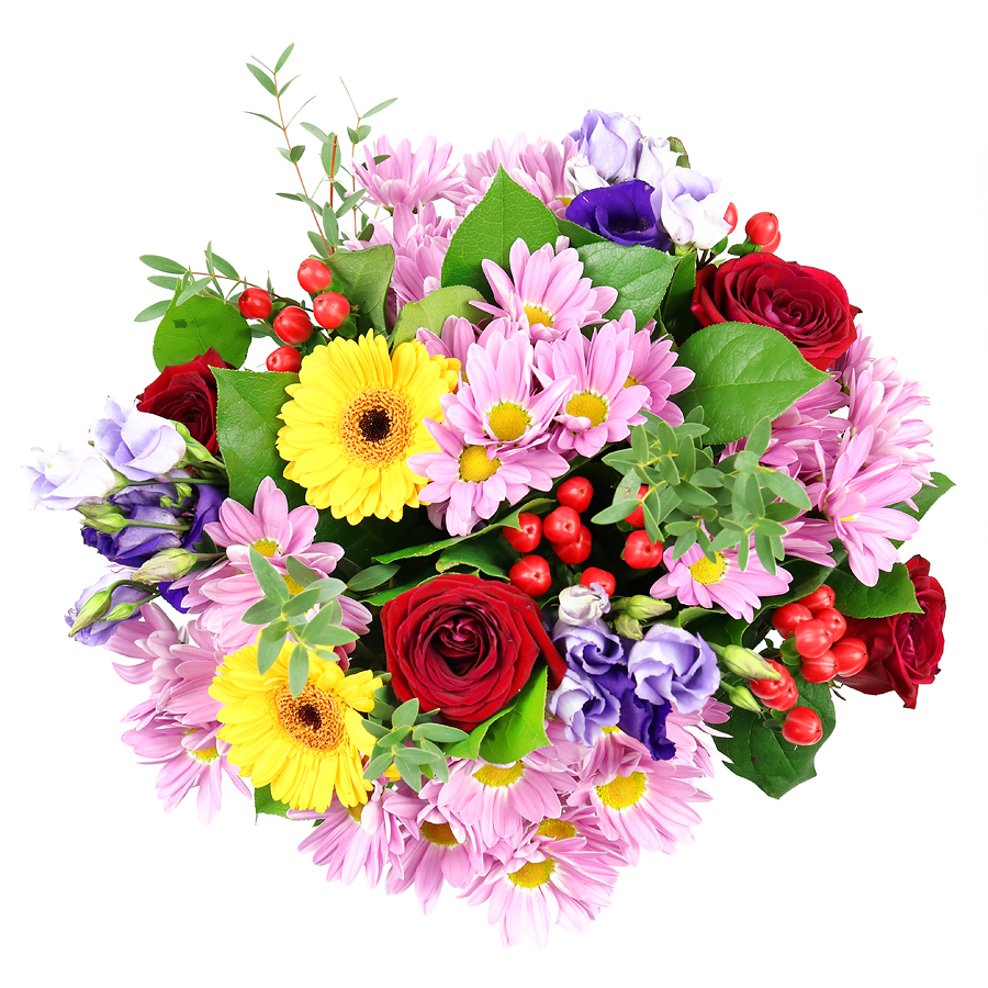 Enhance any space with our beautiful bouquet, a perfect mix of roses, chrysanthemums, hypericum, lisianthus, and gerberas. Each flower is hand-selected to ensure exceptional freshness and striking colors, creating a unique and mesmerizing display.