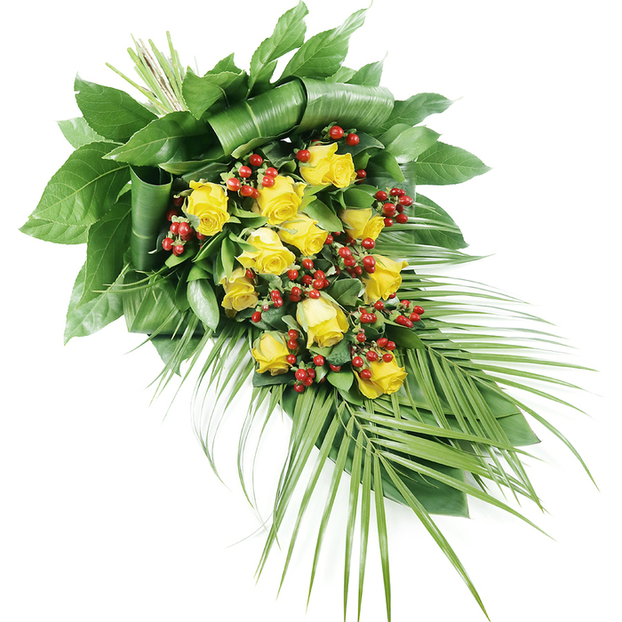Celebrate a cherished memory with our Heaven's Light Spray, a beautifully arranged bouquet designed to honor the departed. Combining vibrant yellow roses with rich red hypericum, this arrangement is a testament to love and remembrance.