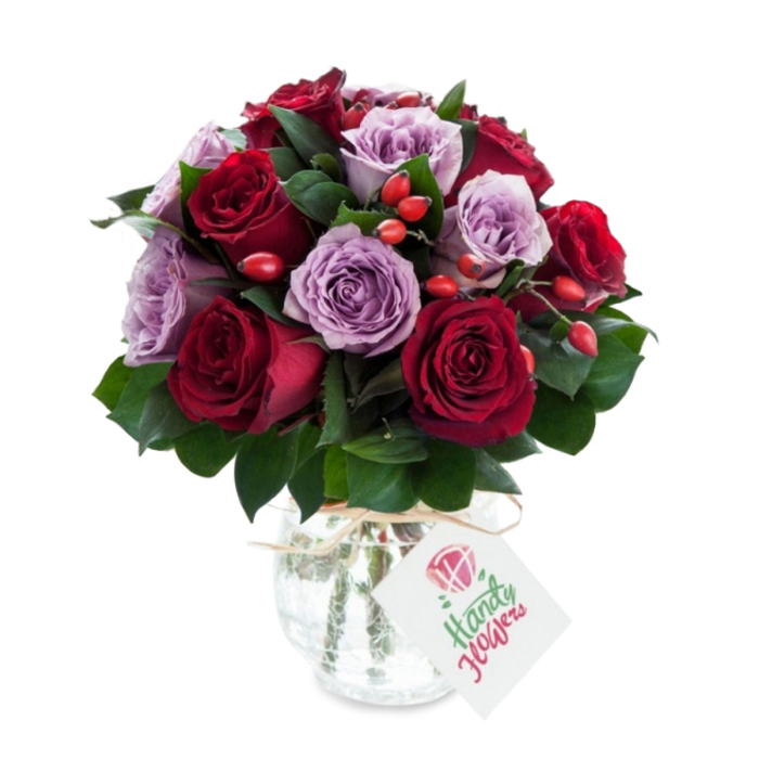Our sophisticated bouquet features a stunning combination of velvet red roses, purple shade roses, and red hypericum, creating a unique and elegant floral arrangement perfect for any occasion.