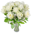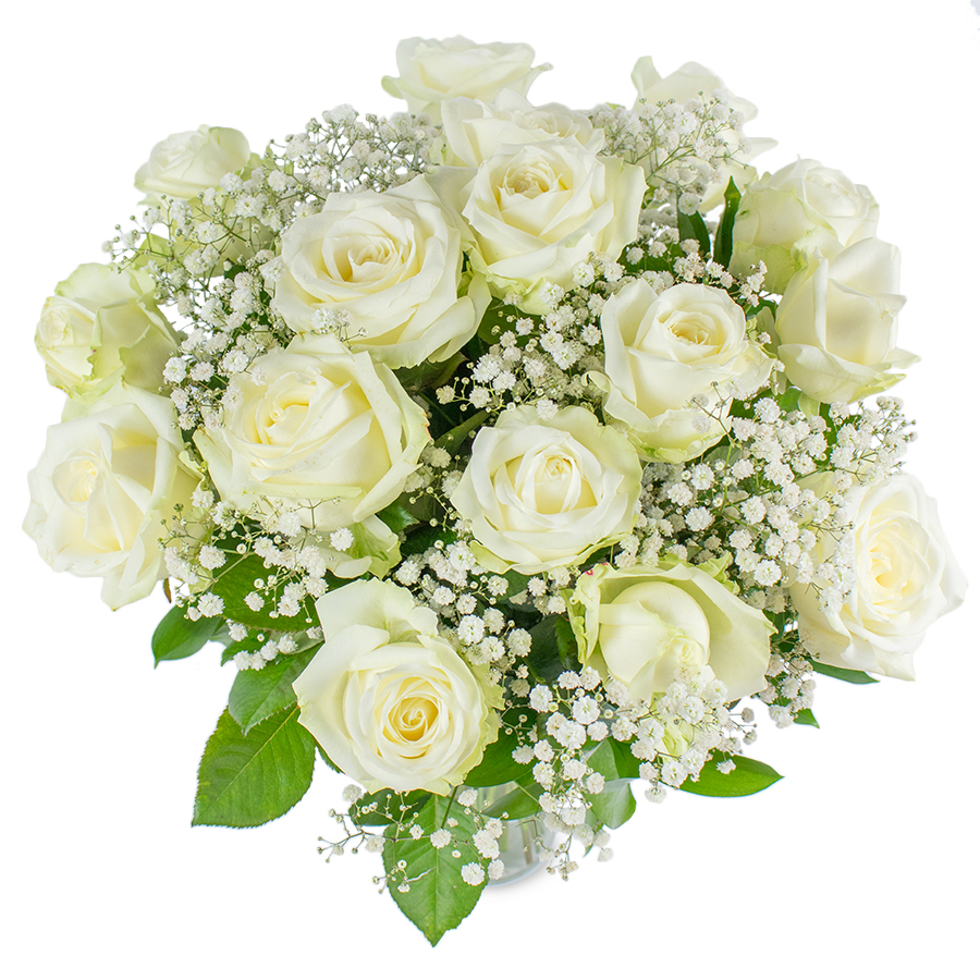 Our stunning floral arrangement features large-headed white roses carefully hand-selected for their freshness and beauty. Enhanced with delicate gypsophila and rich aspidistra leaves, this bouquet offers a captivating blend of elegance and natural splendor.