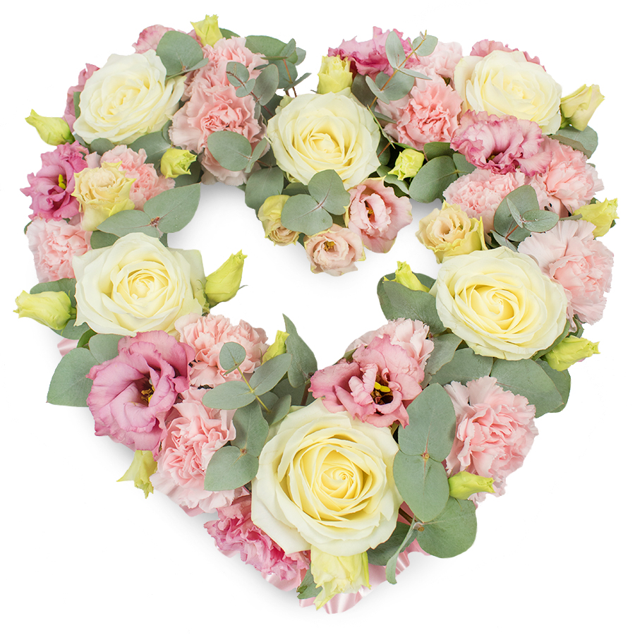 Convey your enduring love and respect with our Timeless Tribute Bouquet. This classic arrangement includes stunning white roses, gentle pink carnations, exquisite pink lisianthus, and lush eucalyptus leaves, beautifully arranged to honor those who have passed.